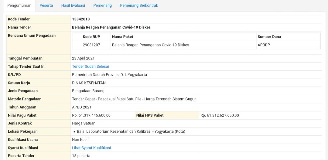 Berdasarkan data yang berhasil dihimpun media ini, tender proyek dengan nama Belanja Reagen Penanganan Covid-19 Diskes Tahun 2021 ditenderkan dengan kode 13842013, tanggal pembuatan 23 April 2021. Sumber dana proyek ini adalah APBD DIY 2021 dengan pagu anggaran Rp 61.317.445.600,00 dan HPS Rp 61.312.627.650,00 dan.